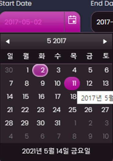 단점은 시작일을 좀 더 이후 날짜로 바꾸려면 먼저 종료일을 넉넉하게 선택하여 시작일의 maxDate를 변경해야