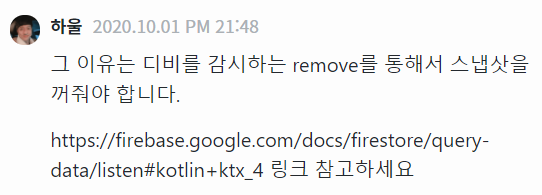 첫줄에 그냥 firestore로 시작한 부분을 followListenerRegistration으로 지정해준다.