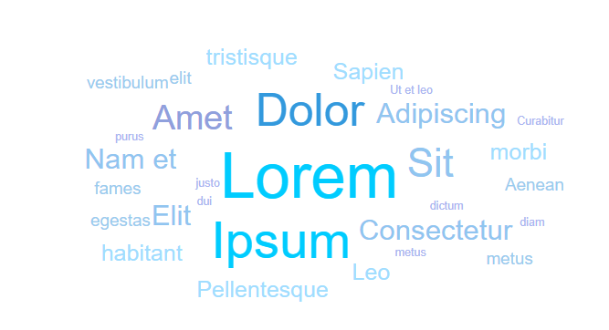No conf Default configuration, no special parameters for words. var words = [ {text: "Lorem", weight: 13}, {text: "Ipsum", weight: 10.5}, {text: "Dolor", weight: 9.4}, {text: "Sit", weight: 8}, {text: "Amet", weight: 6.2}, {text: "Consectetur", weight: 5},
