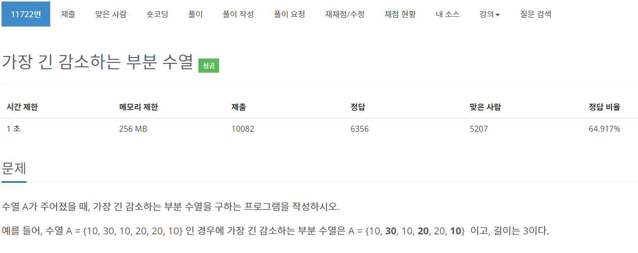이렇게 있으면 1을 기준으로 가장 긴 감소하는 부분 수열은 자기자신 1 하나.