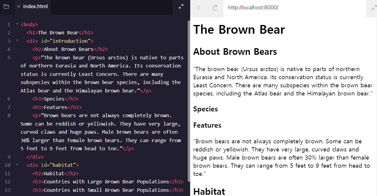 One commonly used attribute is the id. We can use the id attribute to specify different content (such as <div>s) and is really helpful when you use an element more than once. ids have several different purposes in HTML, but for now, we’ll focus on how they can help us identify content on our page.