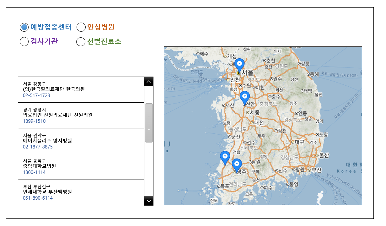 주제가 코로나 관련 병원/예방접종/검사기관을 보여주는거였는데,